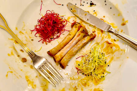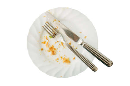 Food leftovers. Dirty plate and cutlery after the meal is finished.