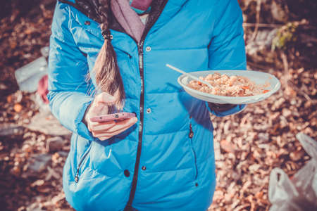 Girl eating plov in nature and looks smart.