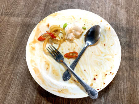 Left-over food .normally seems in hotel and restaurants, Pay for food after eating out . empty plate and fork and spoon