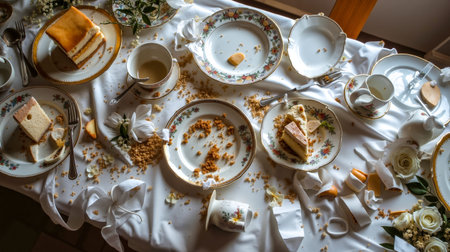 A table covered with a white tablecloth littered with plates cups and crumbs indicating a meal has just ended