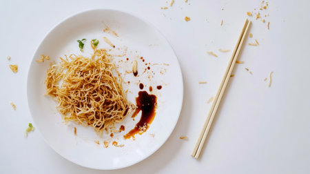 A close-up of a plate with fried noodle remnants, accompanied by chopsticks, showcasing a stylish and clean dining experience with flavorful sauce.