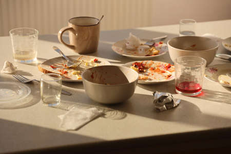 The remains of food in plates, crumbs on the table after lunch or dinner.