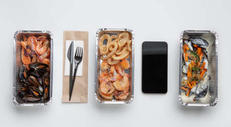 Fast delivery of fish menu from sea restaurant. Fork, knife and napkin on eco paper bag, delicious mussels, shrimps and squid in containers and smartphone, isolated on white background, panorama