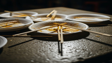 Cluttered table covered with junk food, plastic waste and leftover meals. Concept of food waste and unhealthy eating habits. Overconsumption, environmental issues and fast food culture