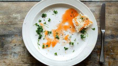 A clean plate showcasing remnants of sauce and fresh parsley rests on a rustic wooden table, evoking a sense of culinary artistry and simple elegance.
