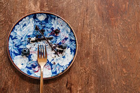 Blueberry cheese cake already eaten left some stain on beautiful luxury ceramic dish with brass fork on wood table