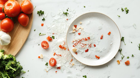 A shattered ceramic plate on a white kitchen countertop, with delicate pieces of the plate scattered among fresh food.