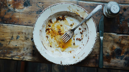 A dirty dish with oily stains and fork resting on top, placed on a rustic dining table after lunch