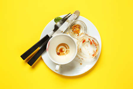 Dirty dish with spoon and fork on yellow background. Copy space