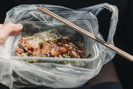 Noodle with savoury roasted duck in delivery plastic takeaway box.