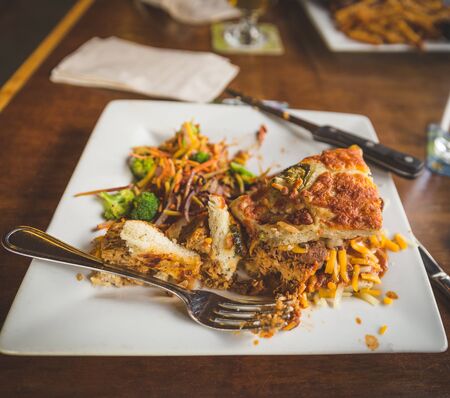Leftover food on a wooden plate with a knife and fork. Close up