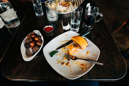 The leftover food and dirty dishes on the restaurant table. Scraps left over after the party.