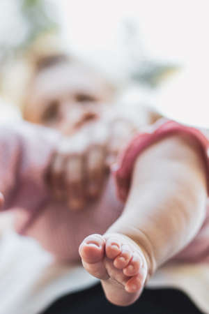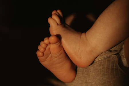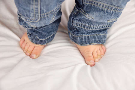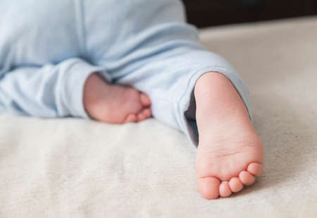 Closeup view of 6 month baby boy feet on white sheet. Starts crawling