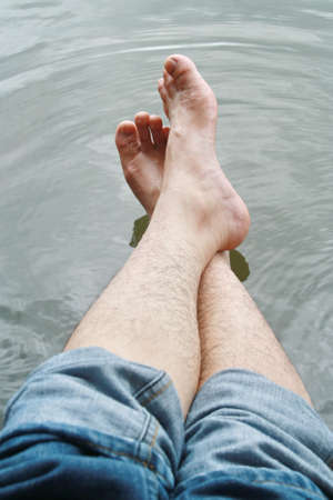 Girl sit near swimming pool showing her legs on top with light reflect on water surface on blue pool