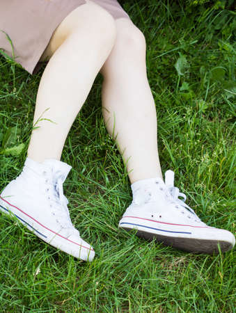 Slender naked female tanned legs top view on the green grass. Woman resting in the park in summer