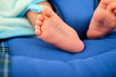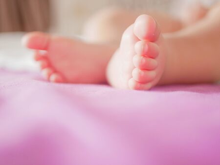 Small legs of a newborn baby. Cute baby feet on the bedspread