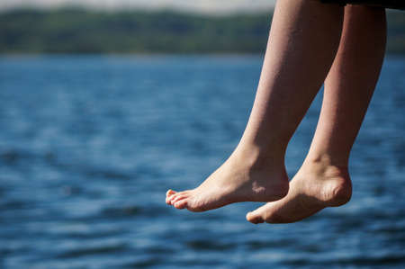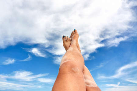 The female feet with blue nails with the summer sky in the background in Bornholm island, Denmark