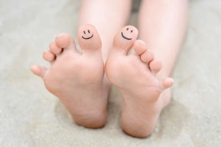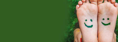 Childrens feet with a pattern of paints smile on the green grass. Selective focus.