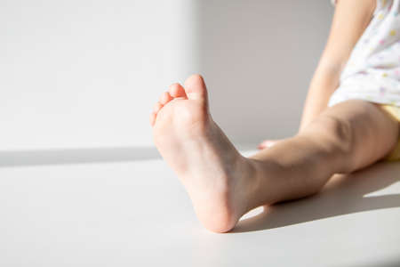 childrens feet on a blue background front view, the concept of prevention of childrens flat feet, hallux valgus