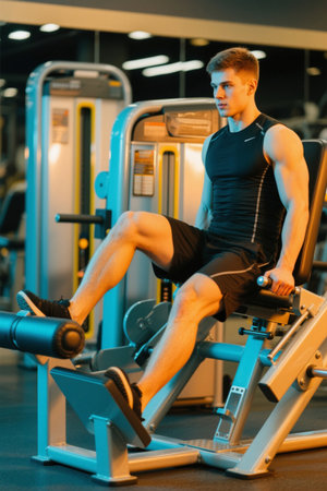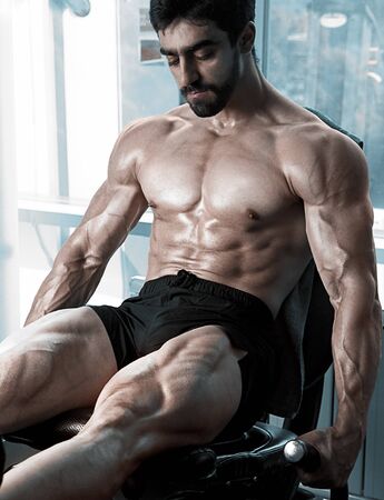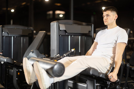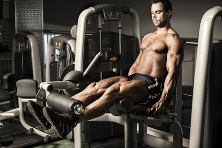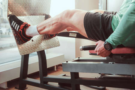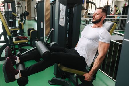 Sportsman pumping muscle exercising and flexing legs on gym machine