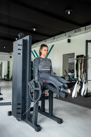 Young fit woman trains quadriceps, leg muscles in exercise machine. Attractive girl working out in the gym