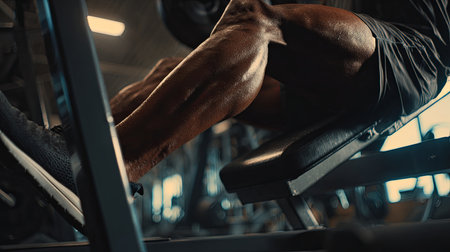 Powerful athlete performing leg press exercise on machine in gym, demonstrating strength and dedication to fitness