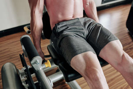 Cropped image of young man doing leg extension for quadriceps in gym machine