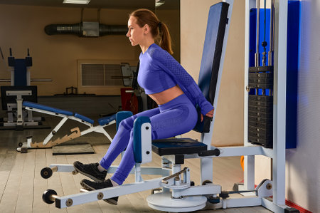Sportswoman performing lower-body strength exercise on fitness equipment