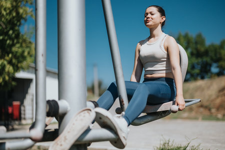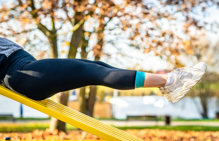 Beautiful athletic girl training legs on a street trainer. For any purpose