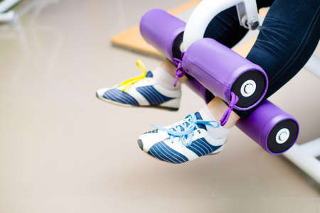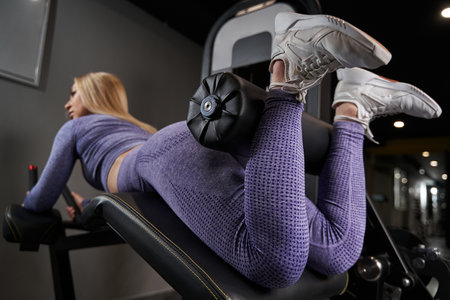 Close up view gym seated leg curl machine exercise woman at indoor in gym. Health concept.