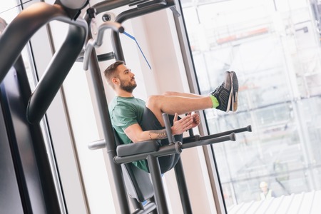 Young active man lifting his legs up on a special gym machinery. Fit lifestyle.