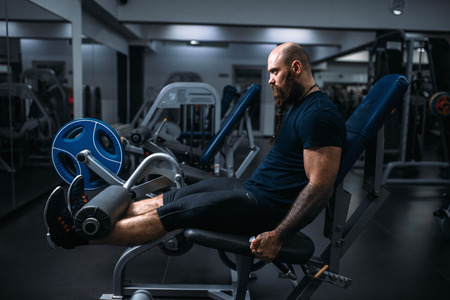 Man trains legs in gym. Handsome bearded bodybuilder training