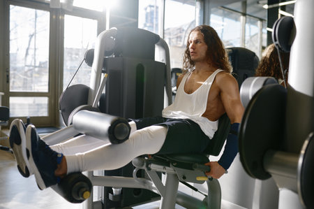 In gym, guy uses gym apparatus to strengthen leg muscles