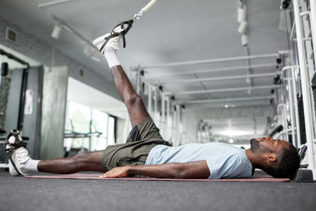 Side view portrait of African American young man doing rehabilitation exercises for leg muscles in gym at physiotherapy clinic