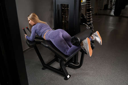 Young sportswoman doing fitness exercises for leg muscles in modern gym