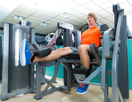 Gym blond man leg extension cuadriceps exercise workout at indoor
