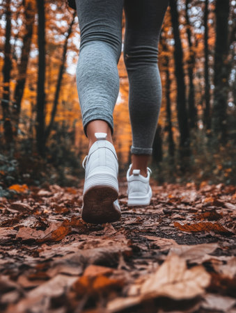 Low-angle view of a person's feet in sneakers, stepping on a road lined with fallen autumn leaves, signaling a change in season.
