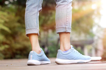 Close up of woman's feet in shoes on ground. Woman in pink sneakers stands in park in summertime