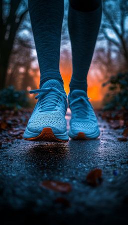 A dynamic image of a runner in gray sneakers captured mid-stride on a brick pathway. Ideal for showcasing fitness, outdoor activity, and energetic lifestyles.