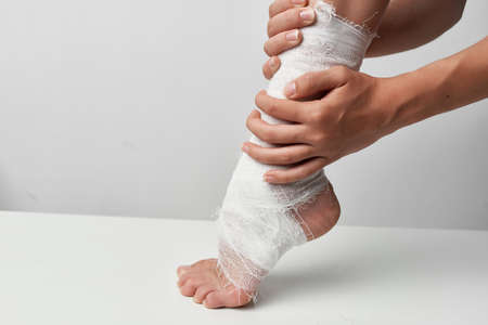 Female foot is bandaged. Ankle injury. Beautician leg wrap. cosmetic procedures. close up