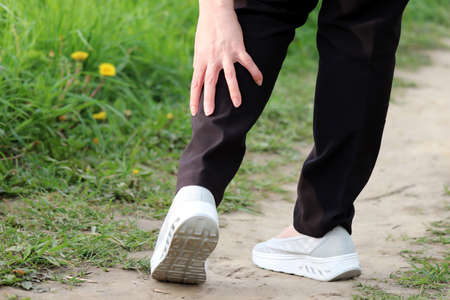 Ankle sprain, woman grabbed her leg while walking on a nature. Concept of tired legs, injury on running