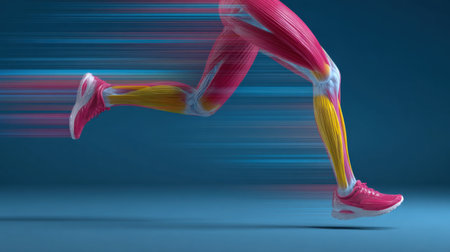 Muscles of a runner highlighted in vibrant colors while sprinting, showcasing the power and speed during the activity on a blue background.
