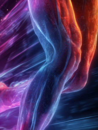 Legs in motion are highlighted by colorful light trails, creating a sense of speed and energy, showcasing a dynamic pose in a digital art style.