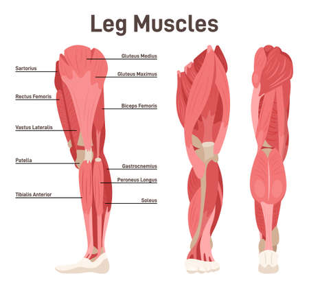 Leg muscle anatomical structure set. Front, side and back view scheme