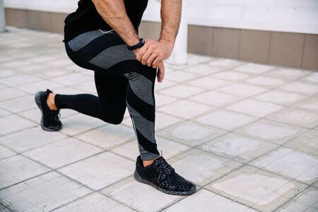 Close-up view of athlete male doing stretching exercise for leg during workout outdoors. Dressed in black sportswear.