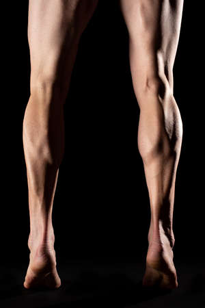 Studio photography of the legs and the calf muscle of a fibrous cyclist athlete with black background