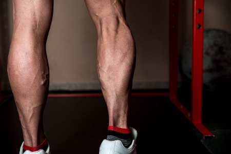 muscular calves of young athlete male wearing sneakers in sport gym