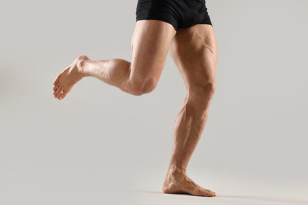 Man with muscular legs on light gray background, closeup