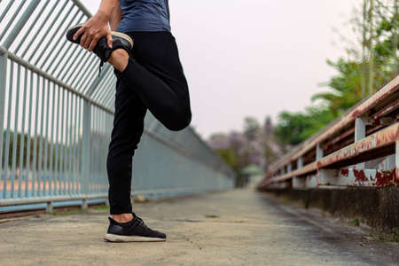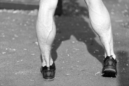 long leg of athlete that runs down the street during the race outdoors