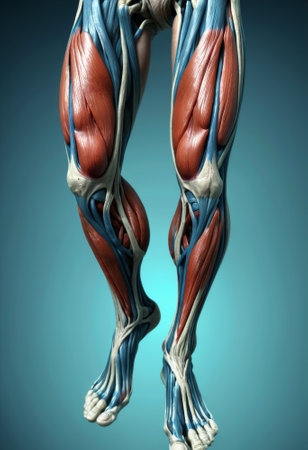 Muscular Human Leg Anatomy, Dynamic Pose, Detailed Muscles, Tendons, Vibrant Color, Studio Shot